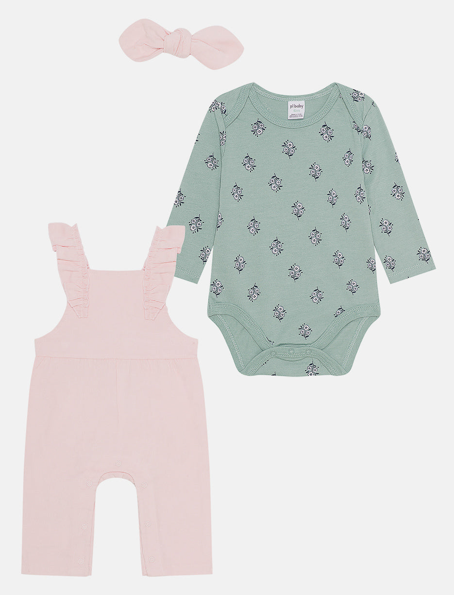 A 2-piece set featuring a long-sleeve printed bodysuit and solid overall with straps. A practical and charming outfit to keep baby comfy and stylish.