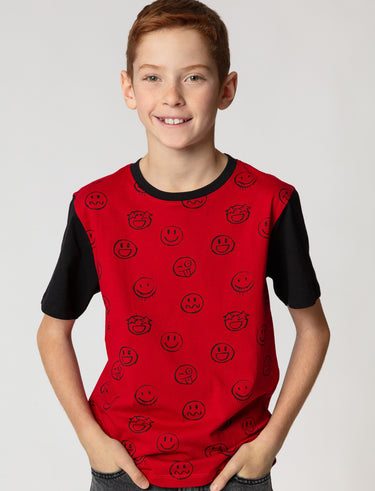 This t-shirt brings a fun and expressive vibe to casual wear with its all-over print and contrasting sleeves. A unique design that stands out in any wardrobe.