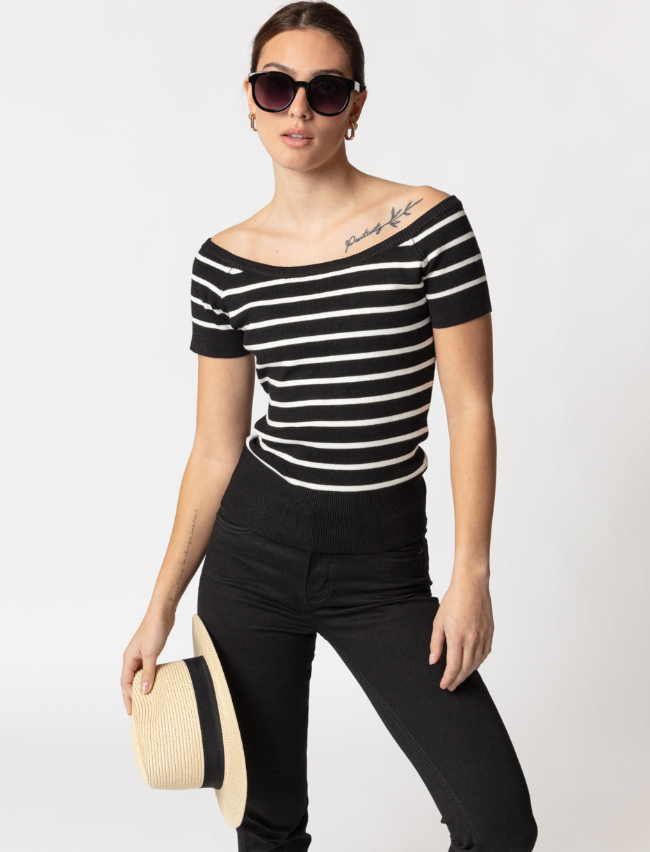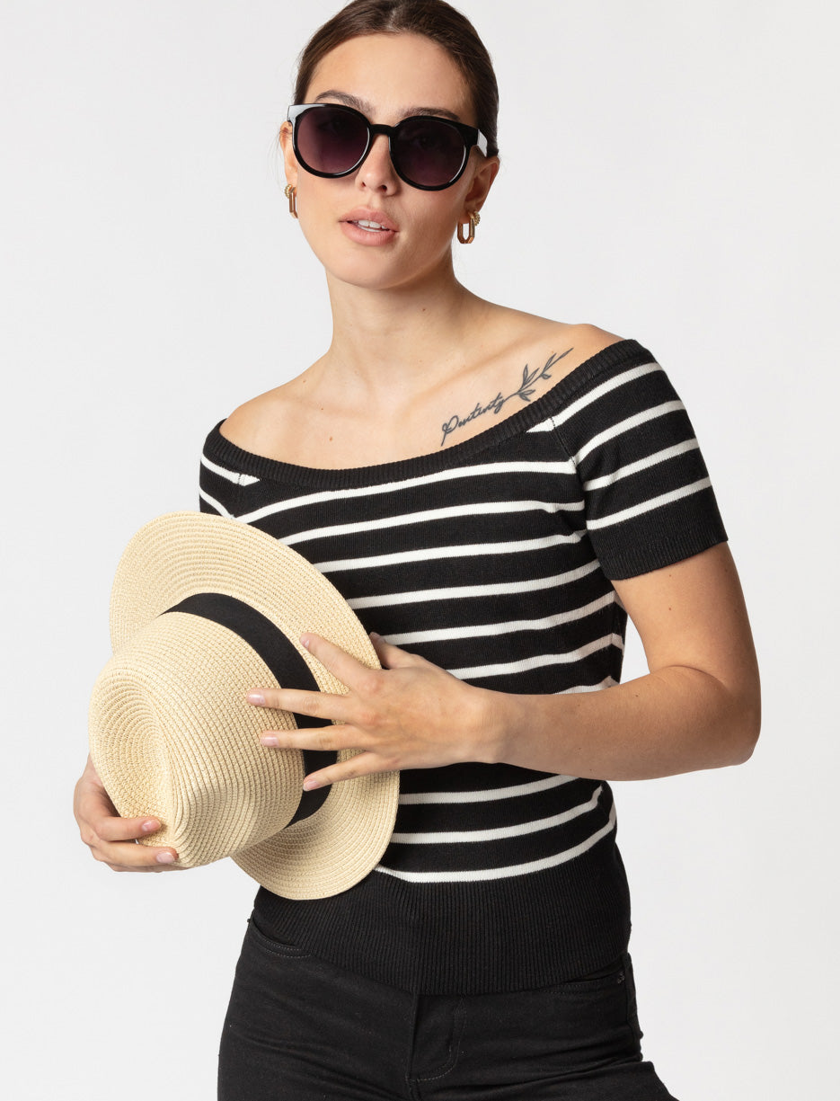 Elegant and effortless, this boat-neck t-shirt is perfect for warm days and casual evenings. Its fitted knit design adds a touch of sophistication, making it versatile for pairing with jeans, skirts, or tailored pants.