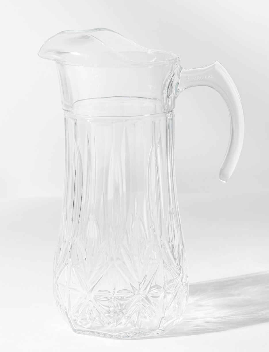 Add a touch of refinement to your table with the Brighton textured glass pitcher. A Luminarc creation from France, perfect for serving drinks in style. Capacity: 1.8 L.