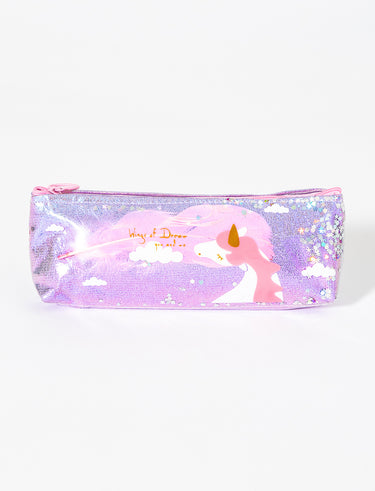 Shiny pencil case featuring a magical unicorn design, perfect for storing pencils and school essentials. Dimensions: 21 x 7 cm (8.26 x 2.75 in)