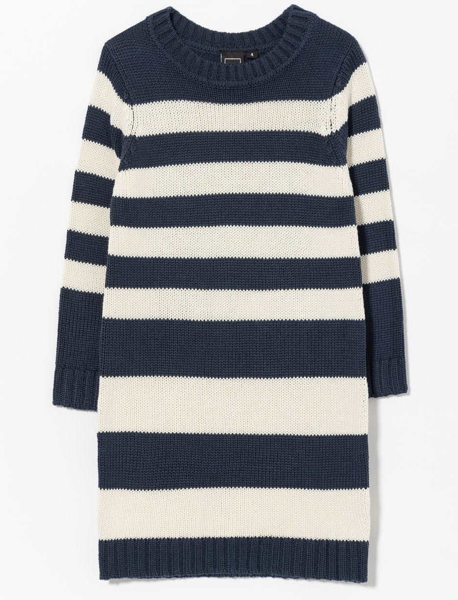 Long striped knit dress, perfect to keep your girl warm in style. The crew neck and ribbed cuffs add a classic touch to this cozy and fashionable piece.