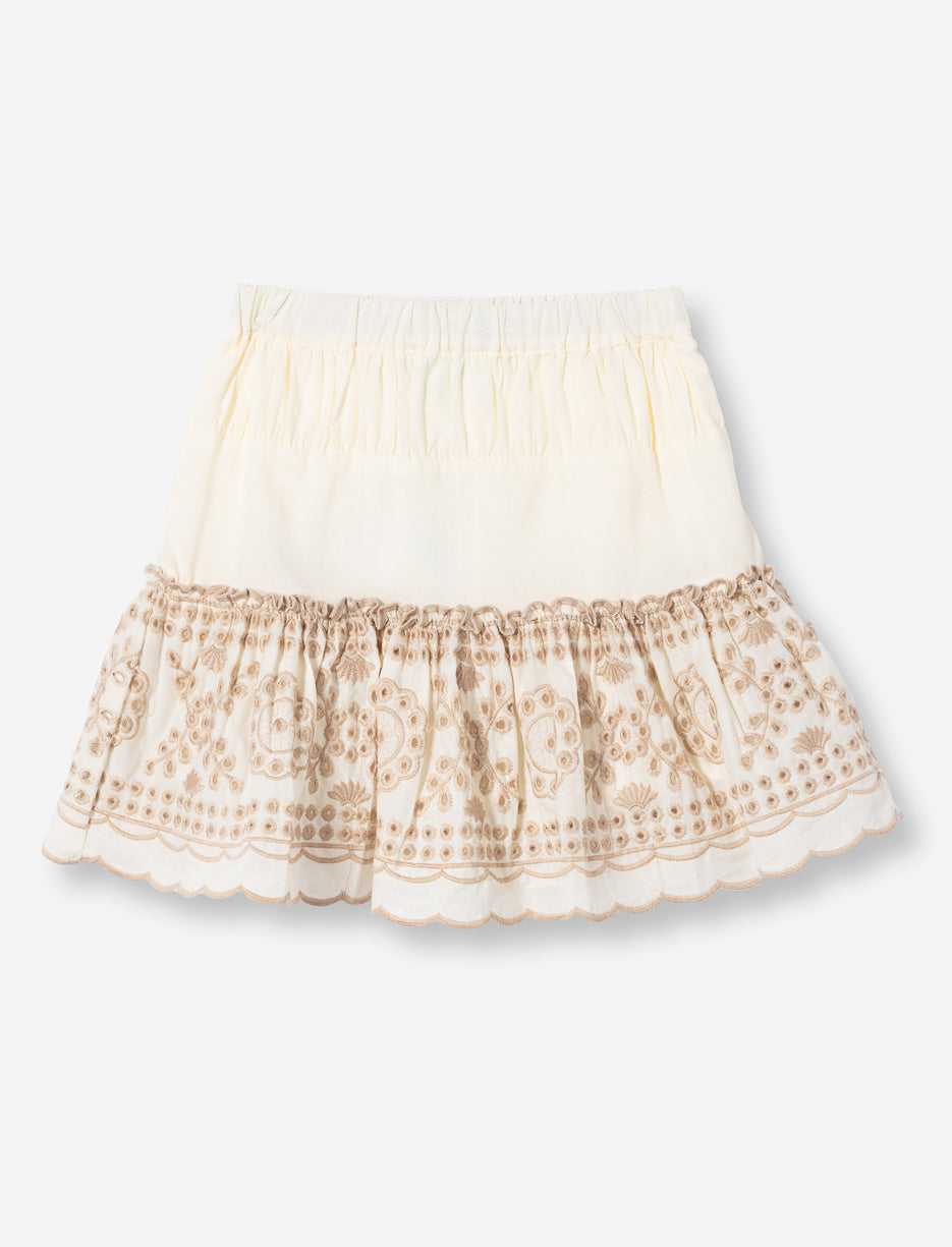 Transform your little girl's wardrobe with this sophisticated skort. The elasticated waist ensures uncompromising comfort, while the gathers and eyelet lace at the hem create an elegant and timeless look. The perfect accessory for every occasion.