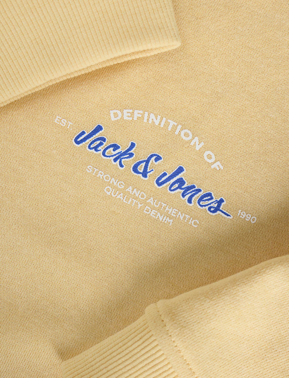 Jack & Jones sweater in vibrant yellow with a dynamic print. This essential basic offers comfort and style for teens looking for casual looks. Its crew neck and modern cut make it easy to pair with any jeans or trousers.