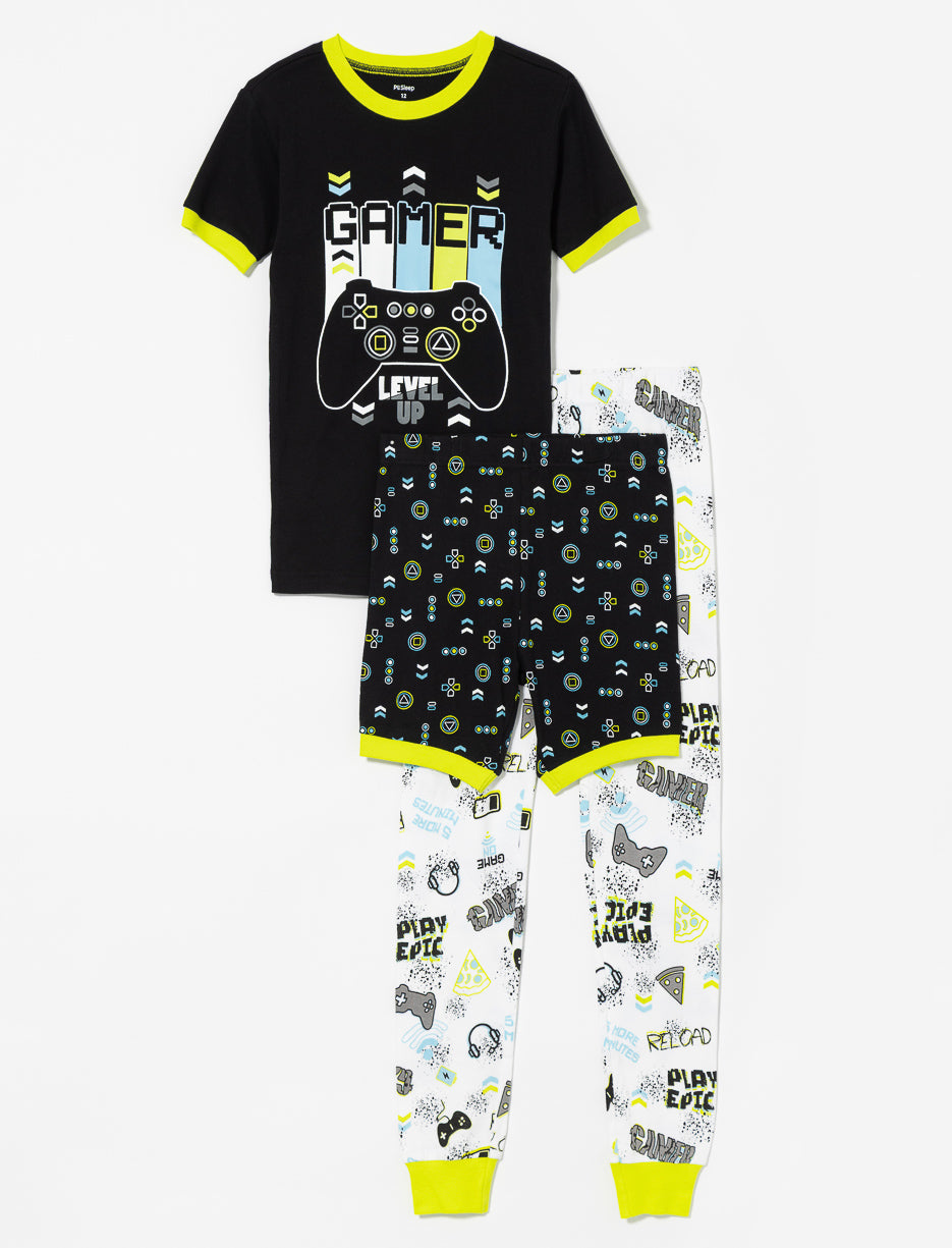 A bedtime trio for gaming fans. Includes a printed tee, shorts, and patterned pants, perfect for comfort and playful style all night long.