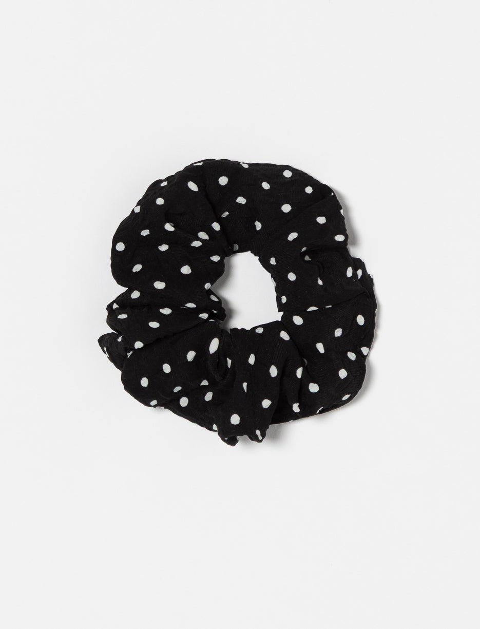 A playful scrunchie with a classic polka dot pattern. Light, soft, and perfect for adding a retro-chic touch to any hairstyle.