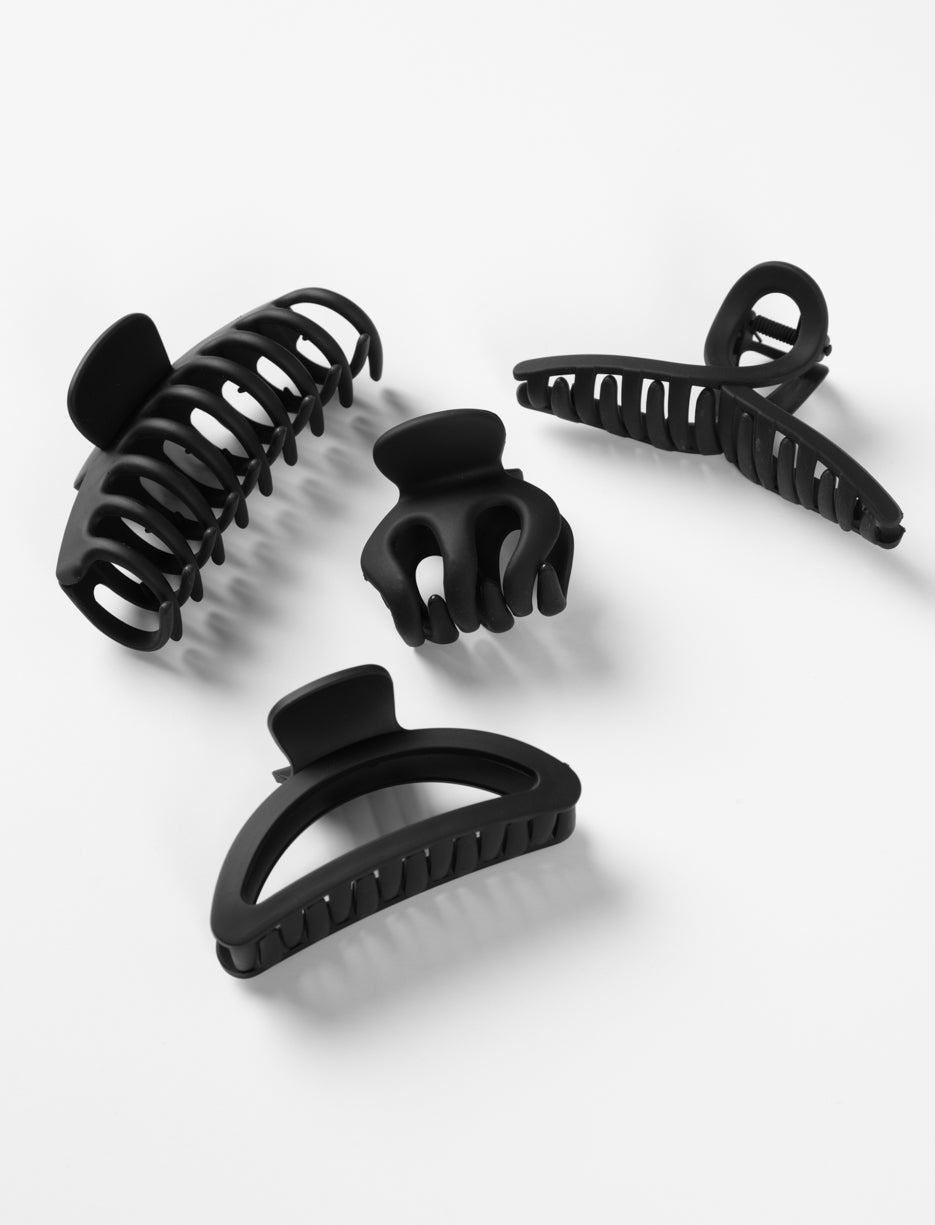 This pack of 4 matte black hair clips offers a versatile selection for any style. Featuring different shapes and sizes, these clips are perfect for securing all hair types.