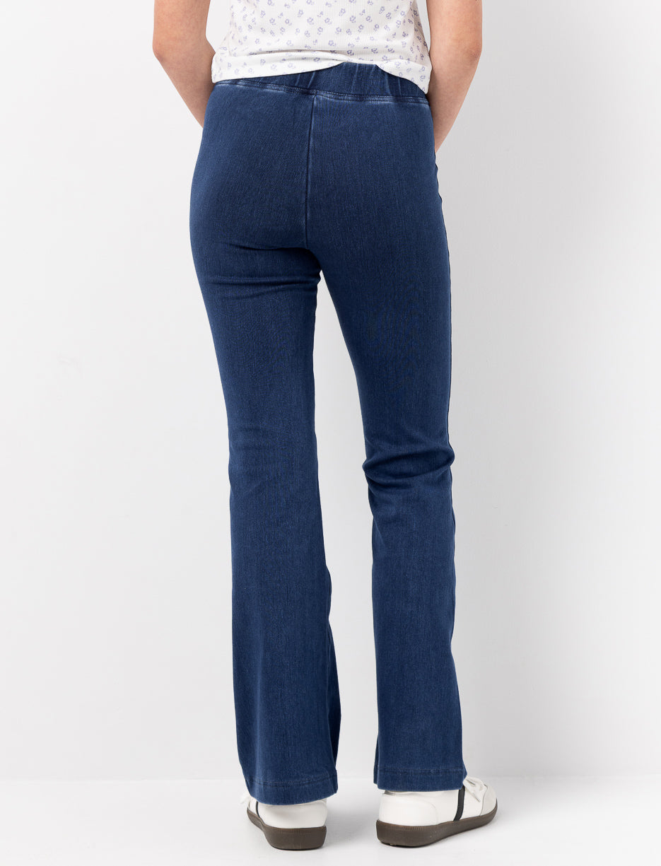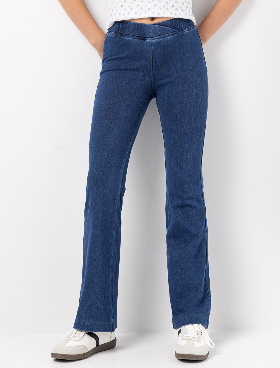 Designed with a flattering crossover waistband and flared silhouette, these stretch denim jeans offer both comfort and style. The soft, flexible fabric ensures ease of movement and a polished everyday look.