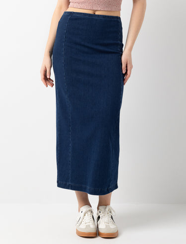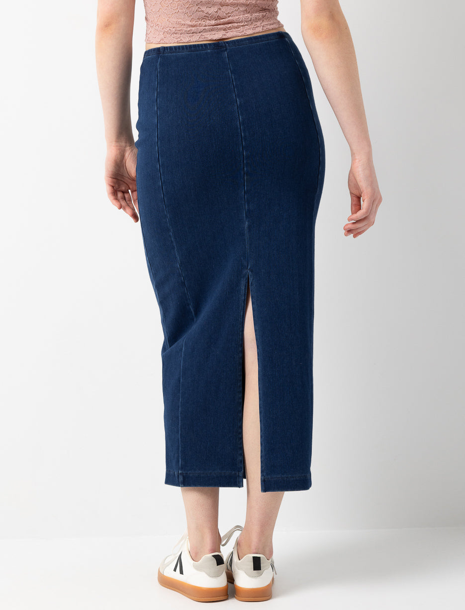 A long sleek denim skirt featuring contrast topstitching and a discreet back slit for added comfort and style. A modern wardrobe staple for any season.
