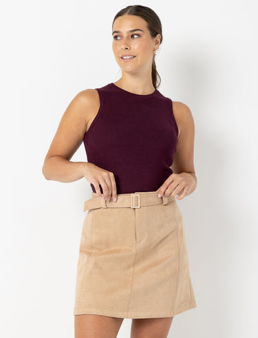 Embrace casual elegance with this suede skirt featuring a matching belt, ideal for finishing your fall-winter outfits.