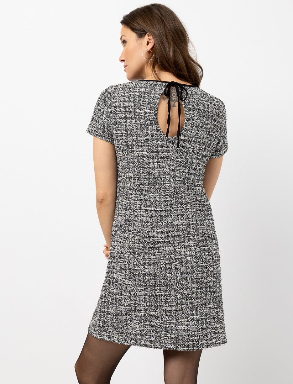This short-sleeve shift dress stands out with its clean, elegant cut. The back bow adds a delicate feminine touch, perfect for a chic everyday look or an evening outing.