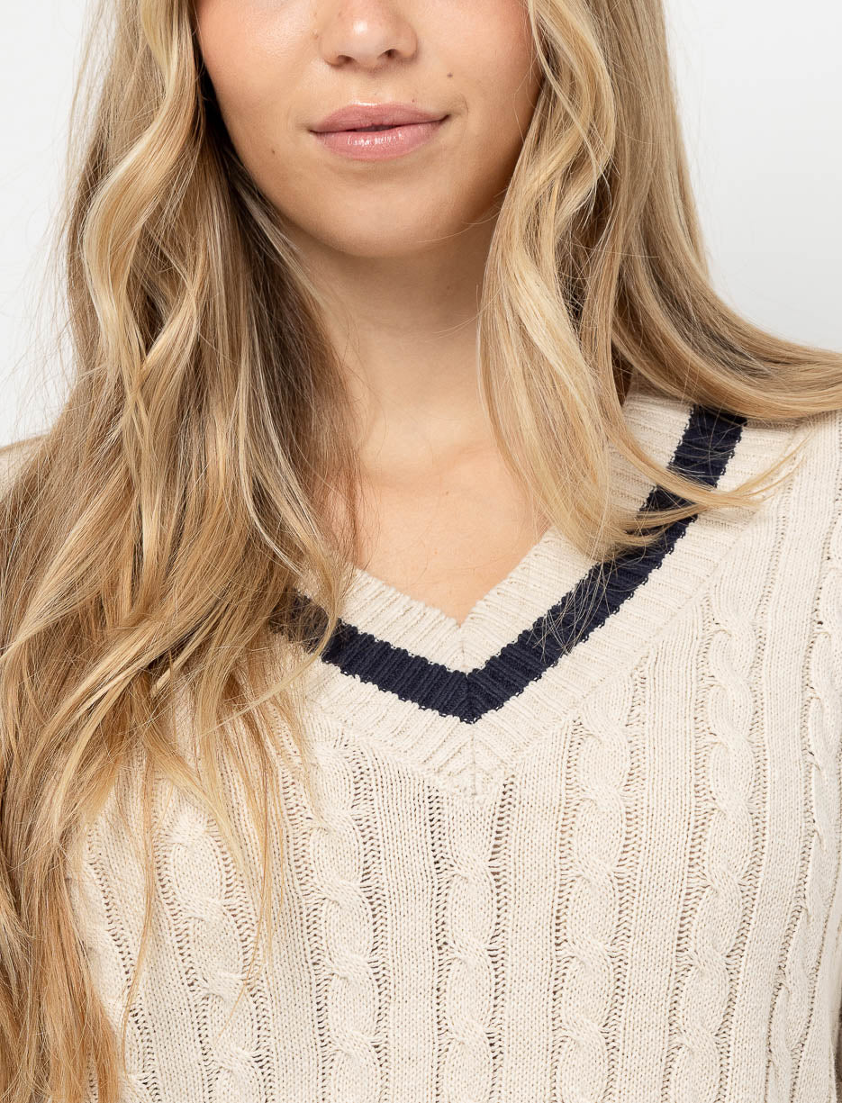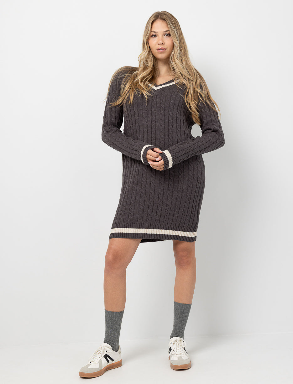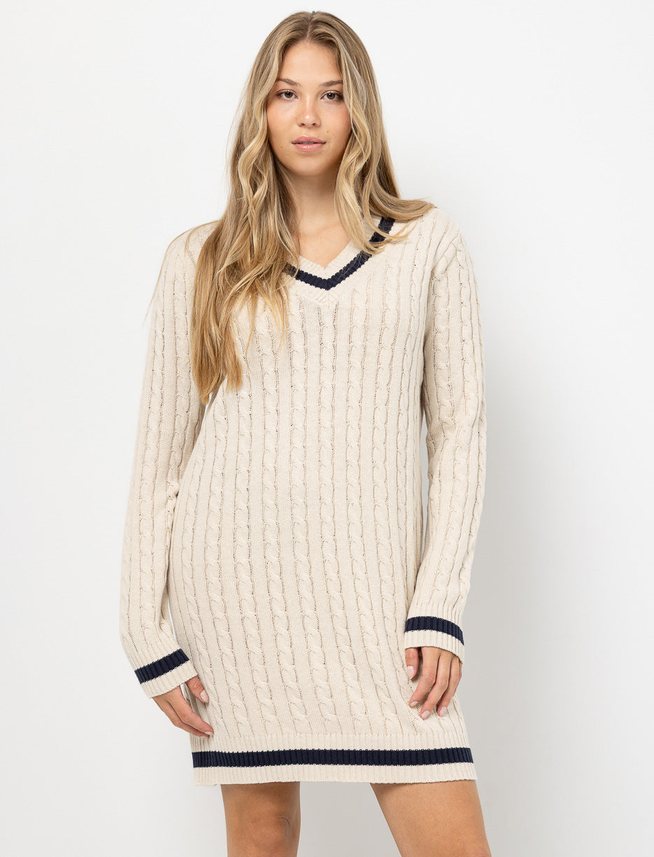 A cable knit dress with long sleeves that blends warmth and elegance. Perfect for a soft, refined look during the cooler season.