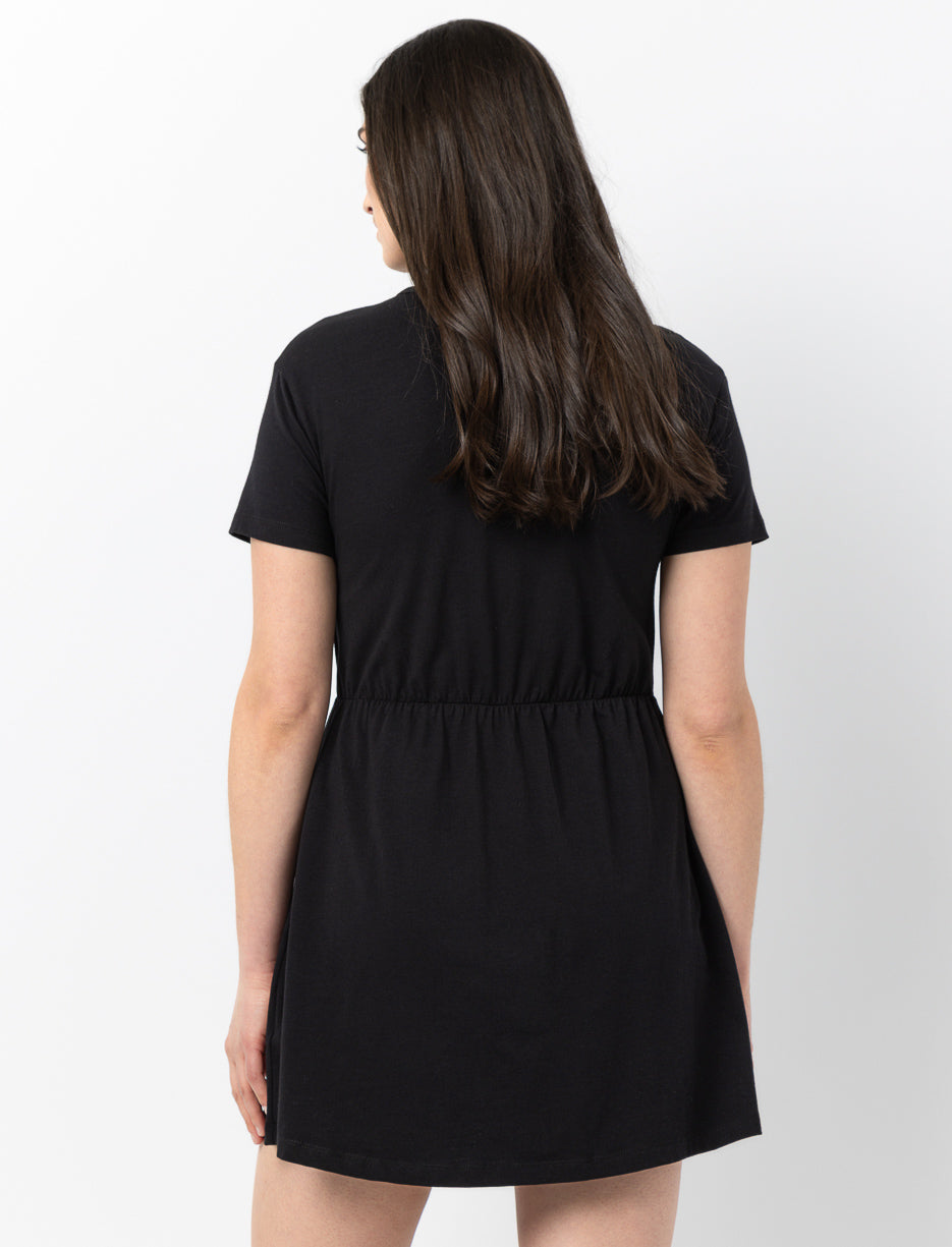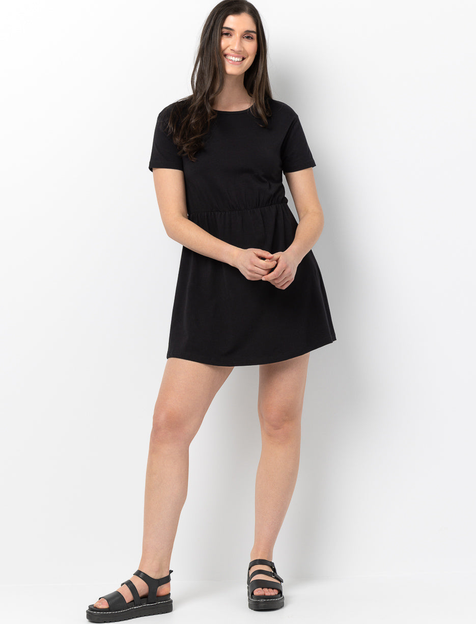 This solid dress features a cinched-waist fit that flatters the silhouette while staying comfortable. With short sleeves and a classic round neckline, it’s an easy everyday piece that delivers a clean, polished look.