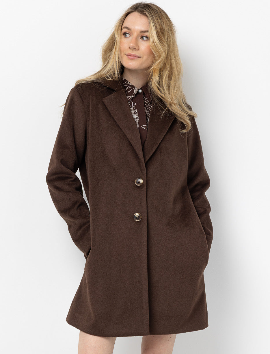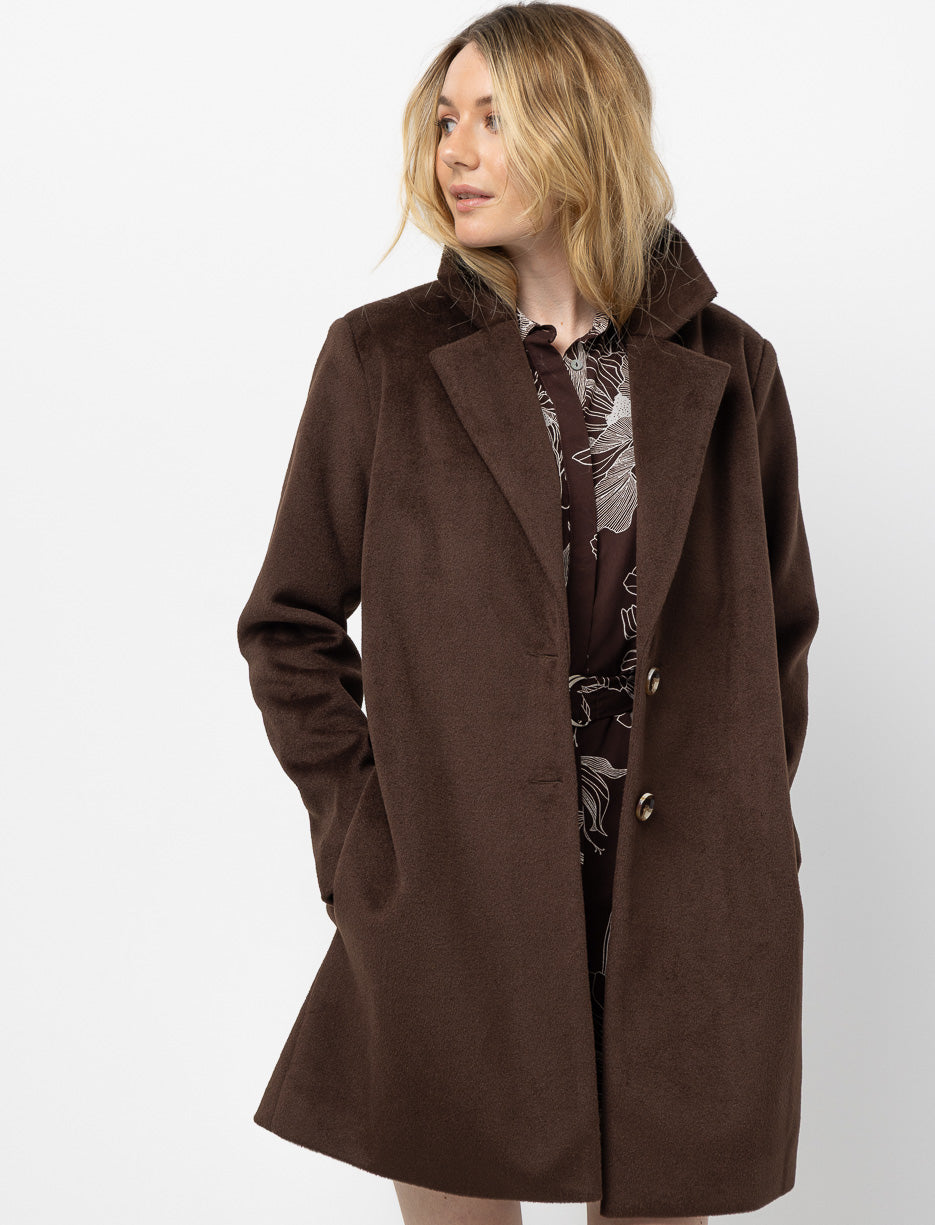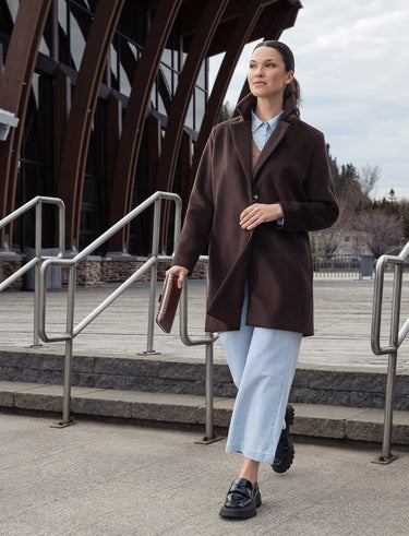 A straight-cut coat with a classic look, featuring a notched collar and two front buttons. Its structured silhouette and discreet pockets make it a timeless piece for all your outings.