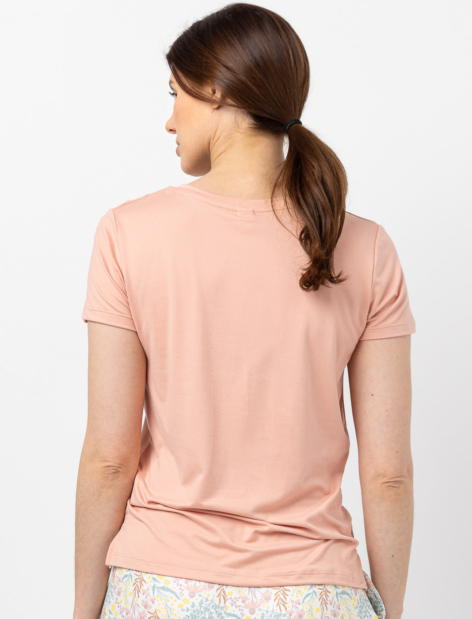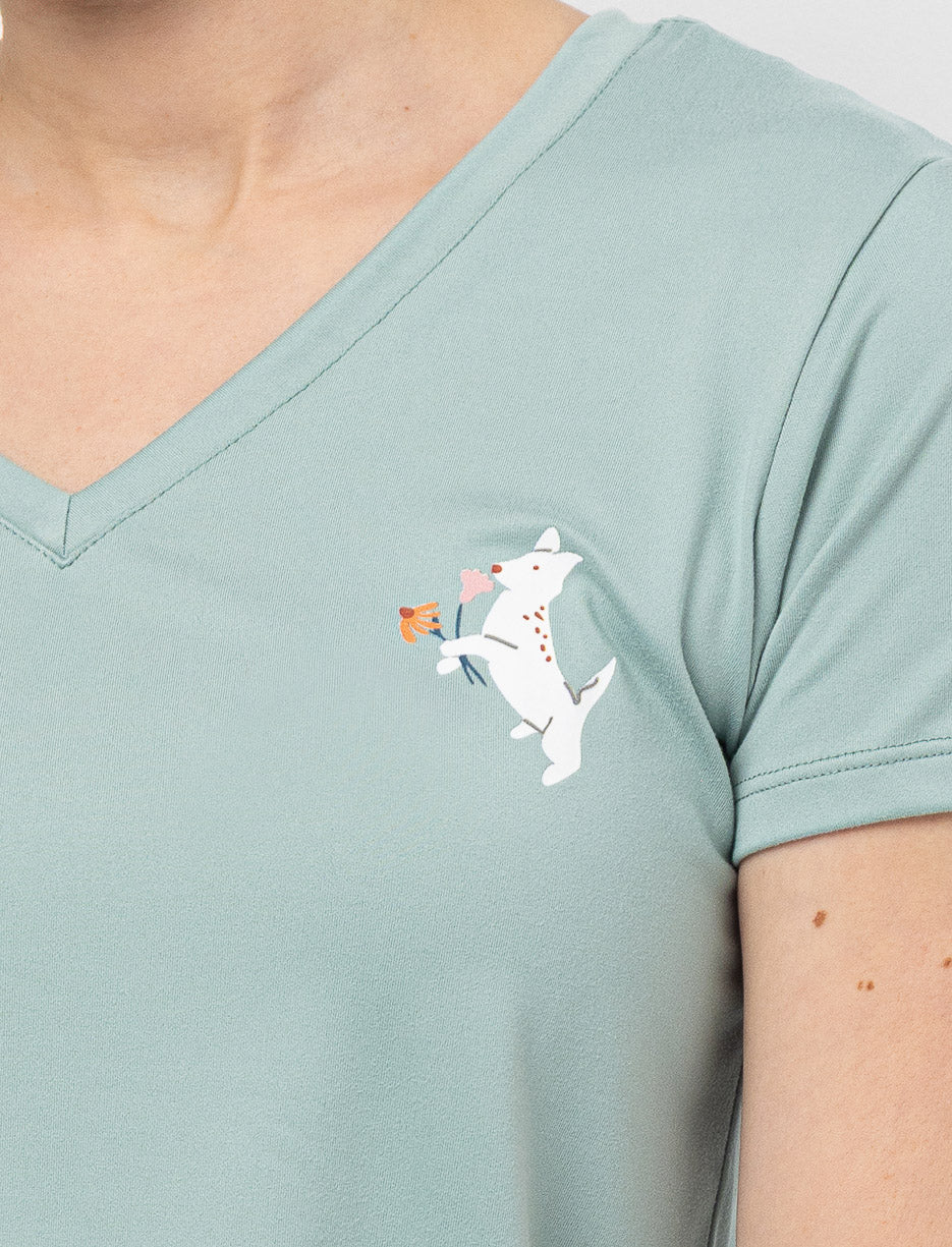 Women's pajamas designed for relaxing nights. This stylish short-sleeved T-shirt with a flattering V-neck hugs your figure gracefully. The front print adds character to your sleepwear, while the side slits ensure unrestricted movement. Made from a soft, breathable fabric, it will quickly become your favorite for comfortable and restful nights.