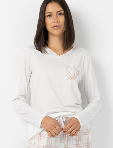 Slip into comfort with this long-sleeve PJ t-shirt, featuring a plaid pocket for a soft and charming touch.