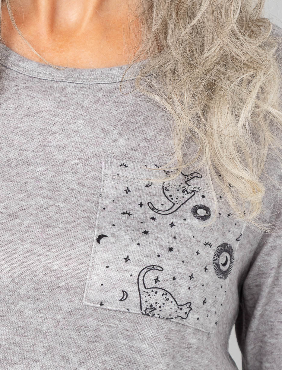 A super soft top made for cozy evenings. Its relaxed fit and playful printed pocket bring charm and comfort to every chill moment.