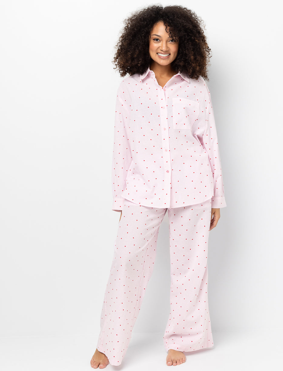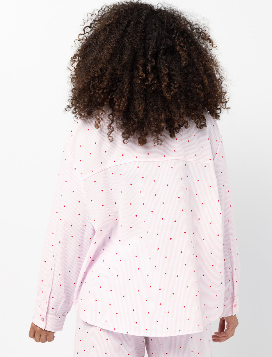 A PJ blouse designed for winding down. Small heart details add a delicate touch, while the button-front style makes it easy to wear for relaxed moments at home.