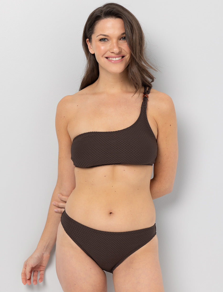 A bikini top that balances simplicity and detail. Its subtle texture, one-shoulder design, and wooden bead add a refined touch, perfect for a well-balanced beach look.