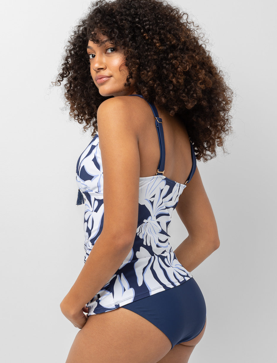 A tankini top with adjustable straps and a front tie that adds an elegant touch. Its flattering underbust cut creates a comfortable, feminine look ideal for easy summer days.