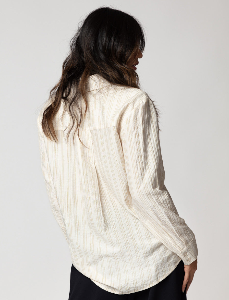 This lightweight, striped button-up shirt combines relaxed elegance with everyday versatility. Its soft texture and timeless design make it a wardrobe essential, perfect for layering or wearing on its own.
