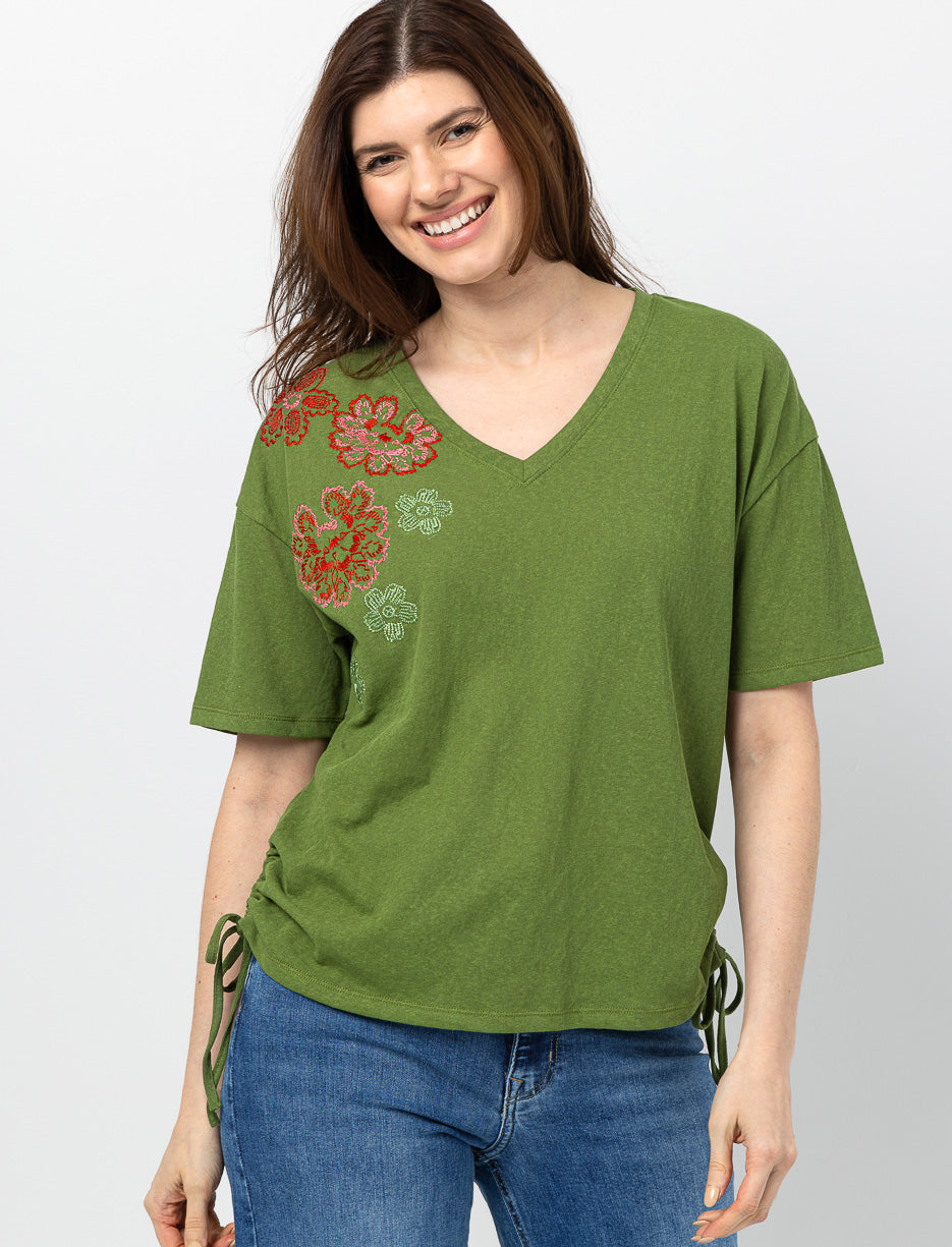 Breathable linen-blend T-shirt for women with short sleeves and a V-neck. Features delicate floral embroidery on the shoulder and an adjustable drawstring hem for a flattering fit. Stylish and comfortable for summer.