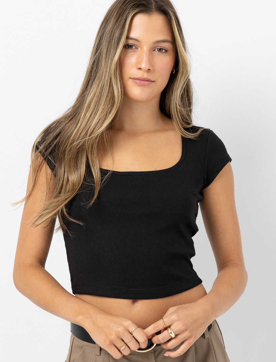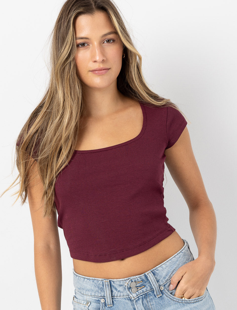 This ribbed wide-neck t-shirt combines style and comfort, offering a feminine look perfect for any casual occasion.