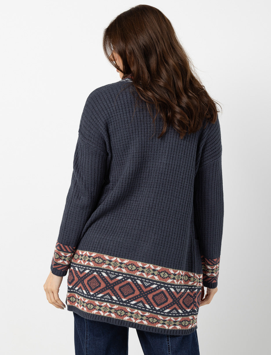 This open-front cardigan features bold Aztec print and contrasting shades for a look that’s both cozy and stylish. Perfect for adding character to your outfits.