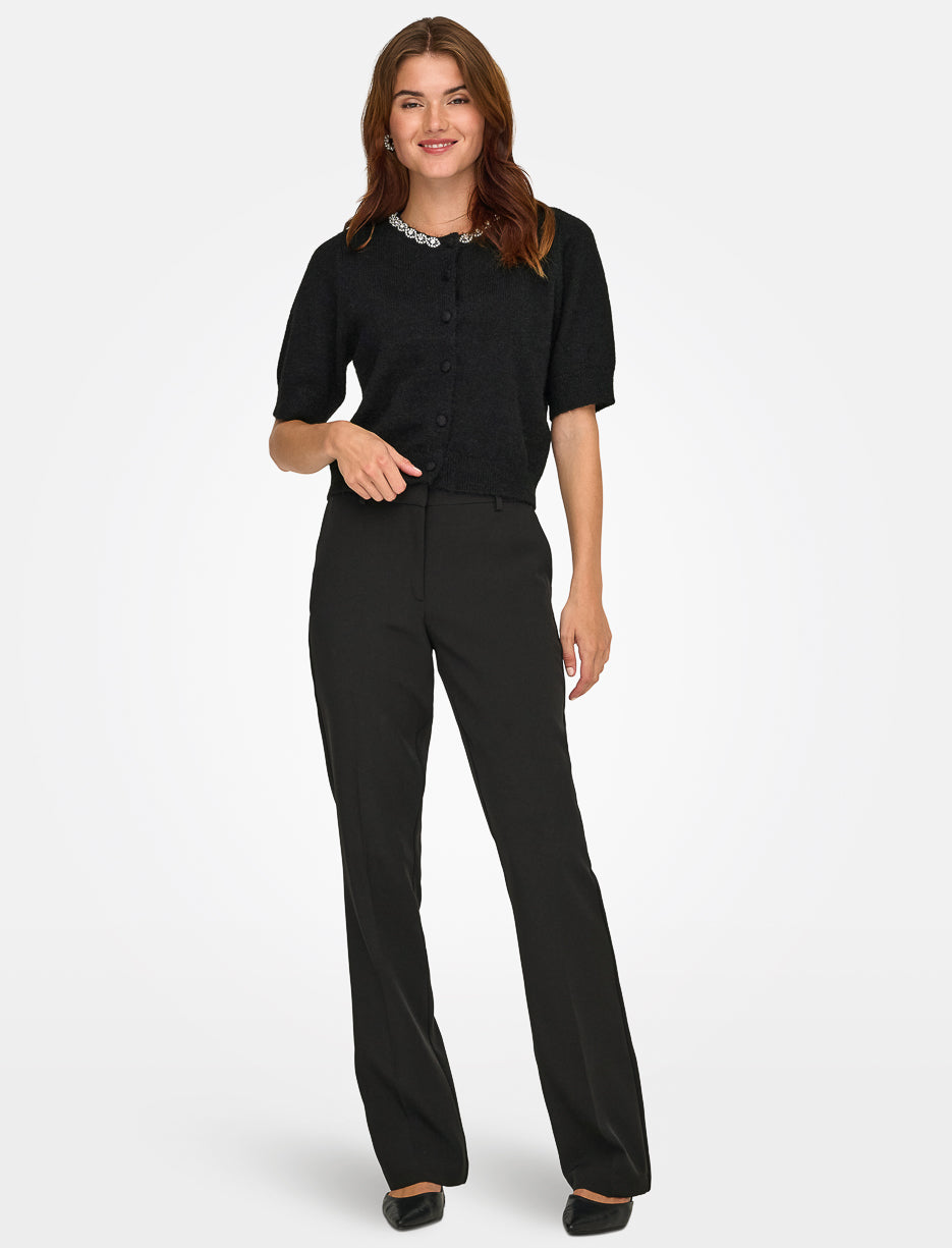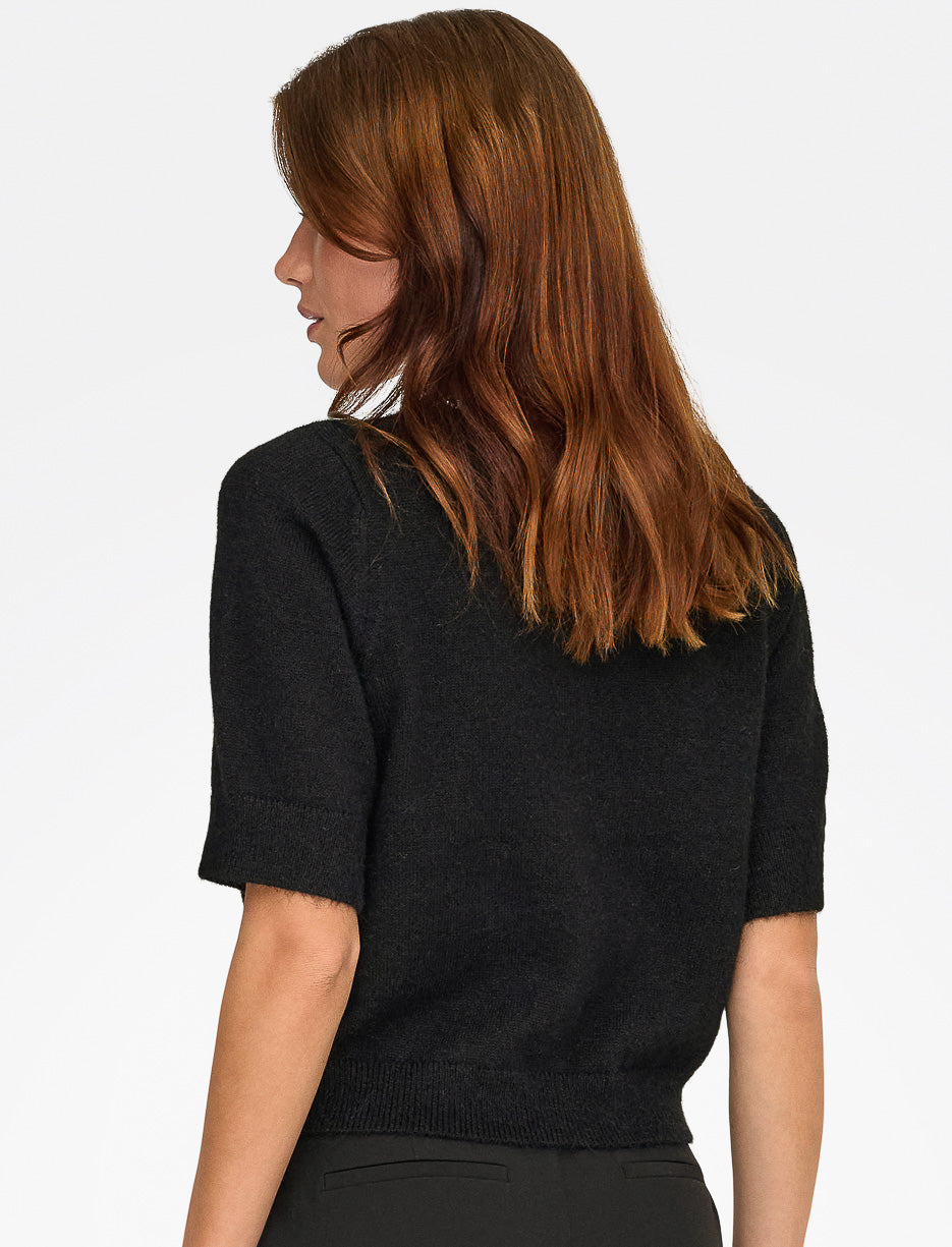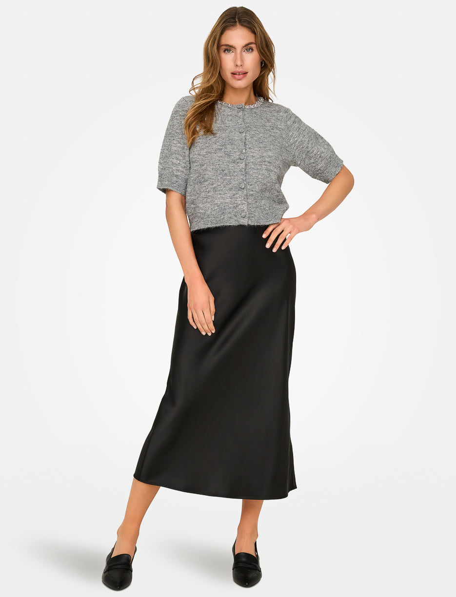 Conçu dans une maille douce et texturée, ce cardigan manches 2/4 se distingue par sa coupe courte moderne et ses boutons recouverts. L’encolure soulignée de strass apporte une finition raffinée.