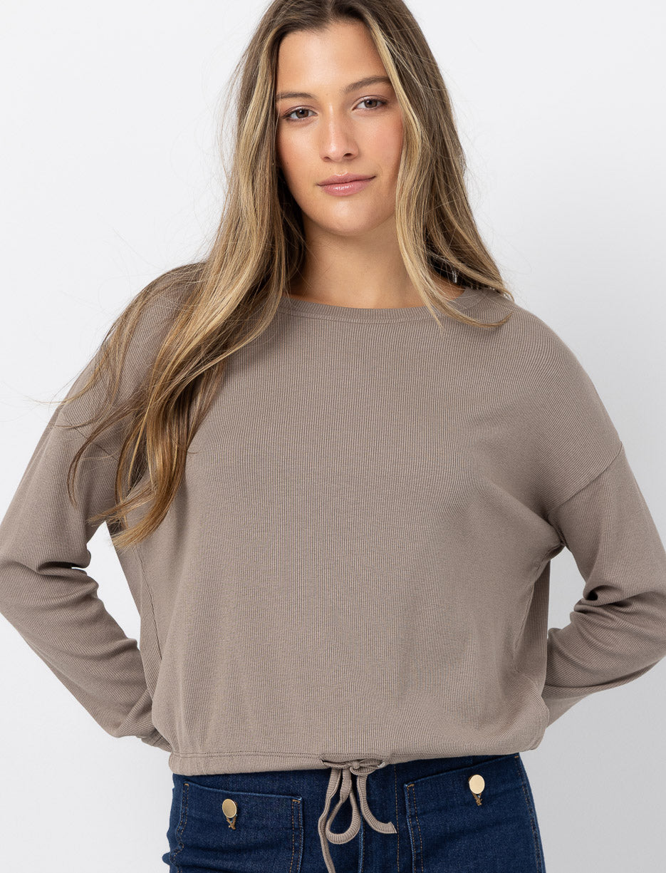 This ribbed sweater with drawstring combines casual style and comfort, perfect for creating modern everyday outfits.