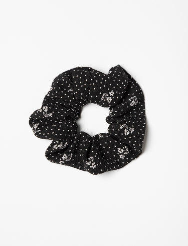 This polka dot and floral print scrunchie adds a delicate, stylish touch to any hairstyle.