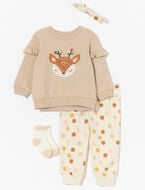 Cozy 2-piece fleece set with ruffle-trim sweatshirt and polka dot jogger pants, paired with a matching headband and socks. Designed to keep your little one warm and comfy in style.