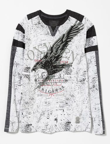 Opt for a trendy look with this long-sleeve t-shirt featuring a split neckline and bold graphic print. A perfect blend of modern comfort and unique design.
