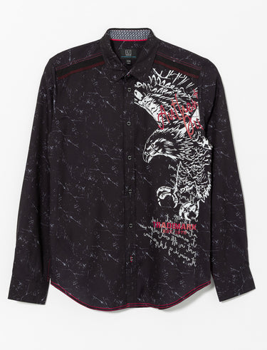 A bold shirt featuring an eagle print and marble texture. Contrast stitching brings a rebellious edge to any urban style.