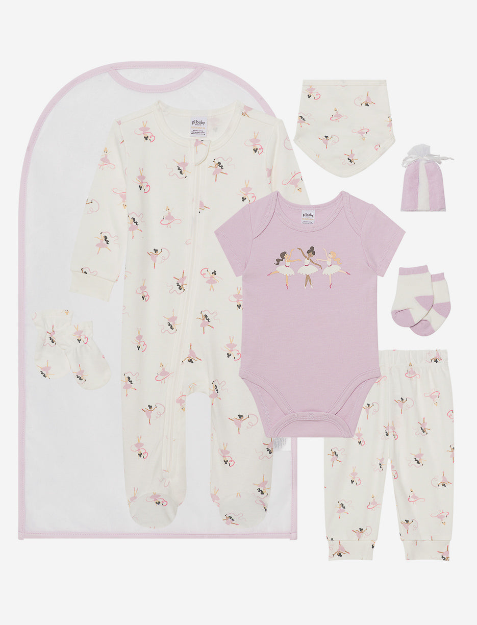 A practical and adorable set featuring a printed sleeper, bodysuit, and pants, paired with matching accessories, all neatly packed in a handy pouch. Perfect as a gift or for dressing baby in both style and comfort.