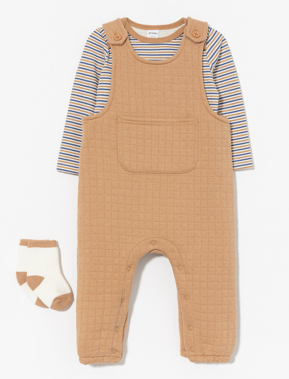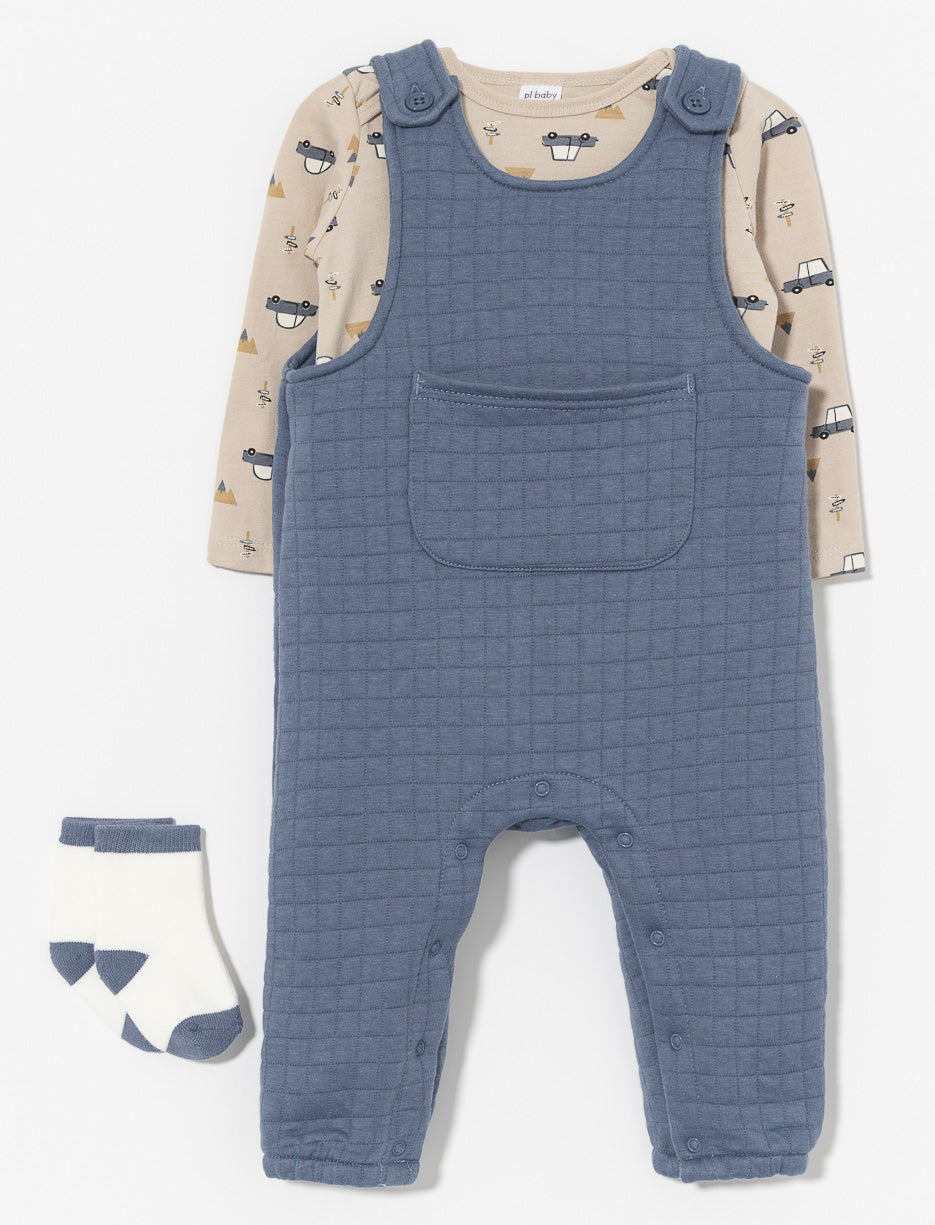2-piece set featuring quilted overalls with a front pocket and a printed long-sleeve top, complete with matching socks. A cozy and stylish choice for your little one.