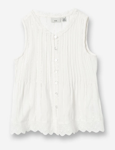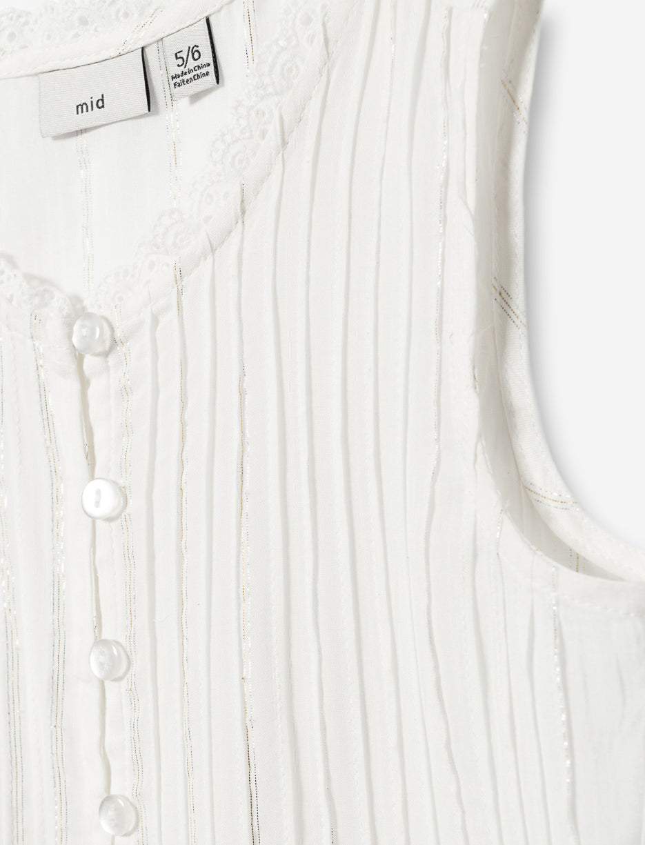 An adorable blouse for little girls! Sleeveless with a round neck, it features trendy stripes and convenient buttons all the way down. Delicate lace at the collar and armholes adds a touch of femininity. Perfect for school days or family outings!