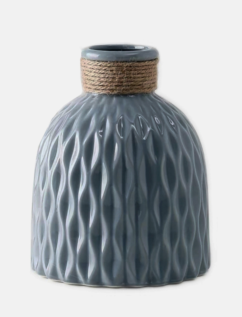 A blue stoneware vase with elegant textured lines and a natural rope accent for a warm decorative touch. Great for displaying flowers or enhancing any room on its own. Dimensions: 11.5 x 11.5 x 15 cm.