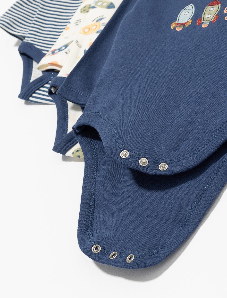 Three superb printed long-sleeve bodysuits join your little one’s wardrobe. Check out the details: stripes, a flag pattern, and a super cute race car drawing. Ideal for cozy layering.