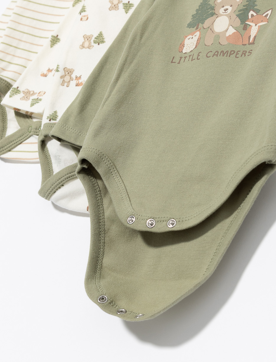 Three superb printed long-sleeve bodysuits join your little one’s wardrobe. Check out the details: stripes, a flag pattern, and a super cute race car drawing. Ideal for cozy layering.