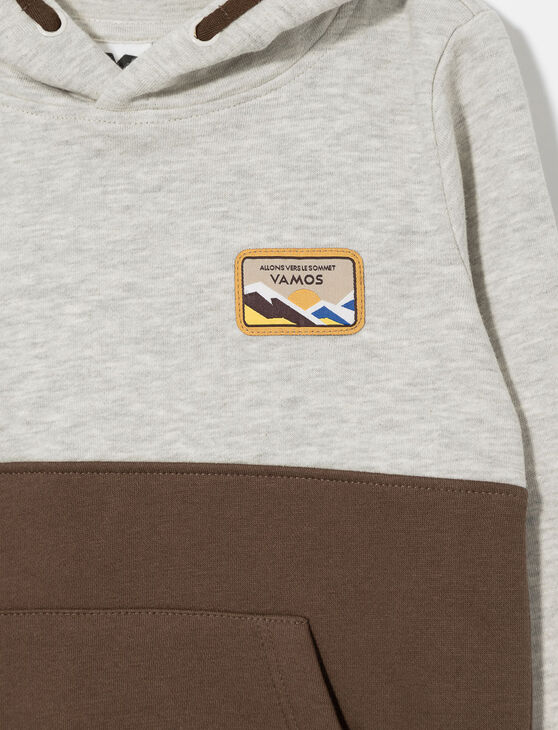 Colour block hoodie for teen boys, featuring a kangaroo pocket, a chest badge, and ribbed finishes at the edges. Perfect for cool, comfy moments.