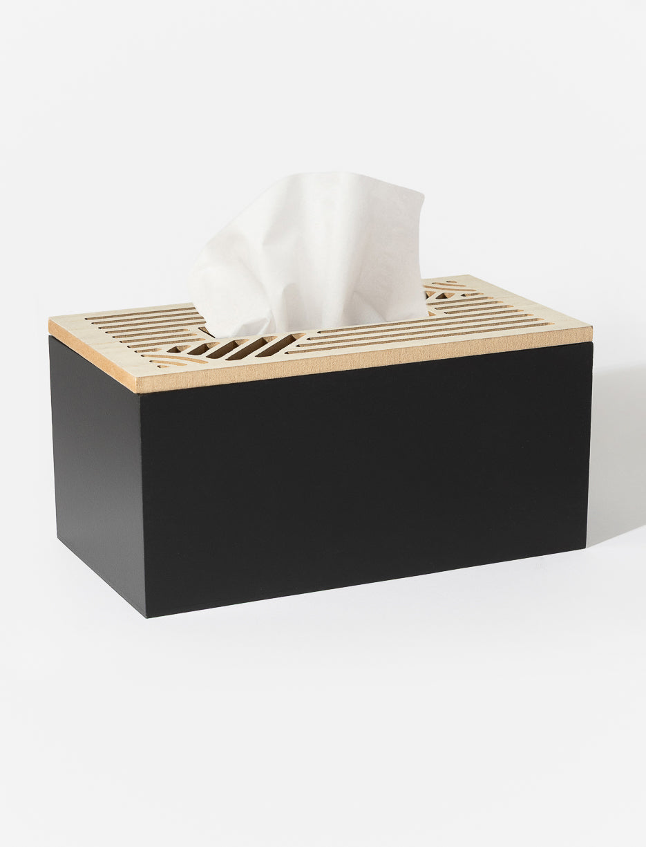 Stylish and practical, this tissue box cover hides standard tissue boxes while blending beautifully with your decor. The cutout lid and contrasting base add a modern touch. Dimensions: 24 x 13 x 11.5 cm.