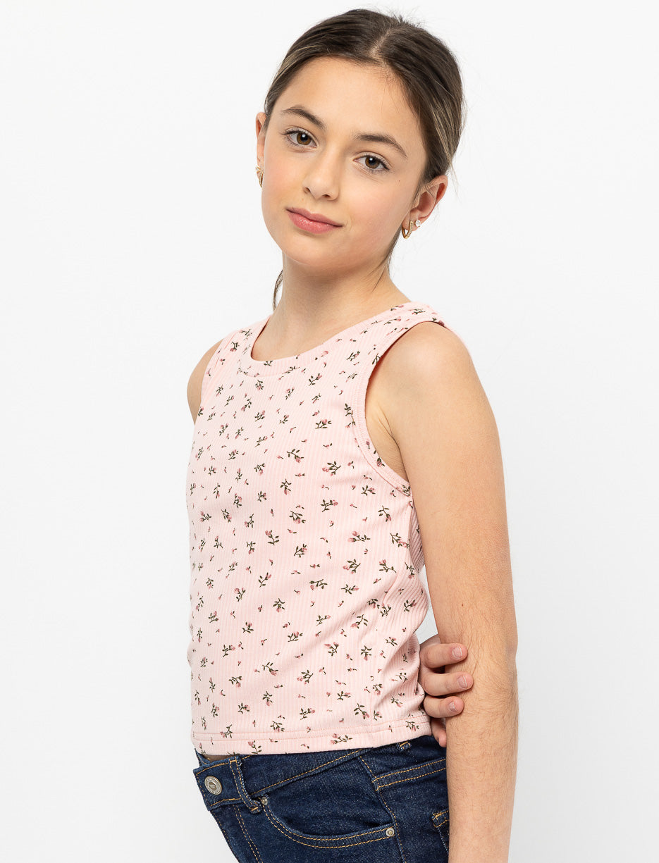 Trendy camisole for young girls with an adorable round neck and an all-over floral print. Perfect for adding a touch of color and style to her summer wardrobe!