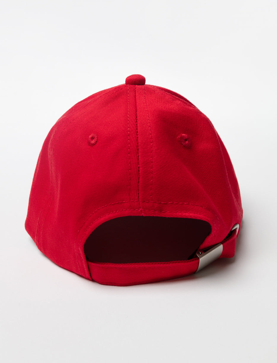 A sporty cap for little champions! With its bold red color and varsity-style patch, it’s perfect for adding energy to any outfit. The curved brim offers sun protection, while the adjustable fit ensures all-day comfort.