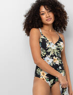 This printed 1-piece swimsuit features a flattering cross-front drape and slim convertible straps for an adjustable fit. A stylish, comfortable piece that brings confidence to every sun-filled moment.