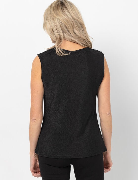 Elegant and luminous, this draped neck tank top catches the light beautifully. Its soft shimmer and fluid fit bring a chic touch to your day or evening looks.