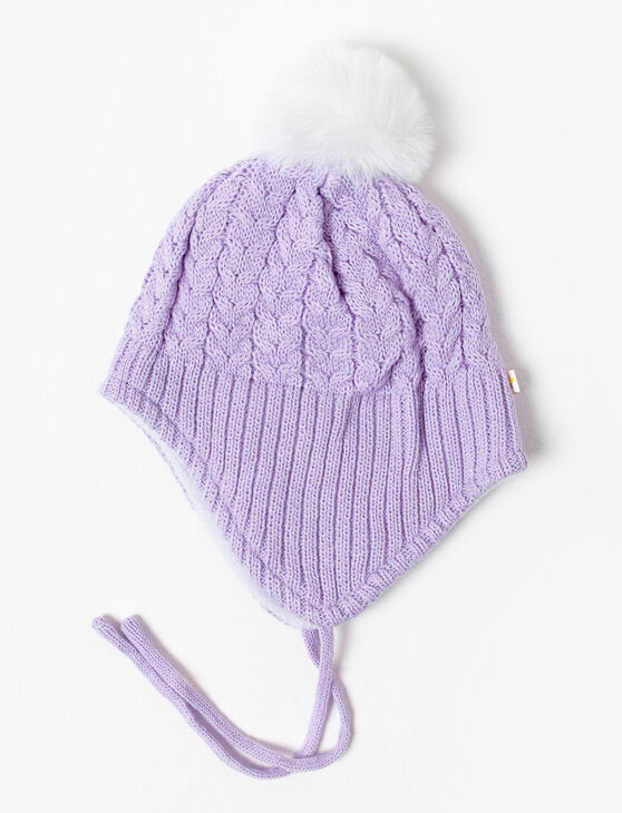An adorable pompom beanie that keeps your little girl warm while adding a cheerful touch to her winter days.