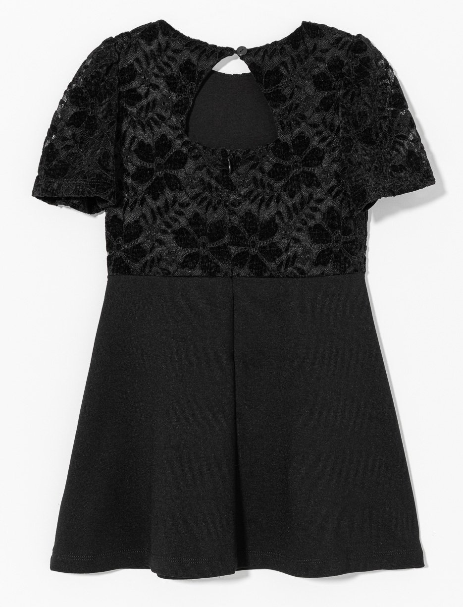 Give your little one a touch of elegance with this delicate lace dress featuring short sleeves and a flared hem. The back keyhole detail adds both comfort and charm for any special occasion.