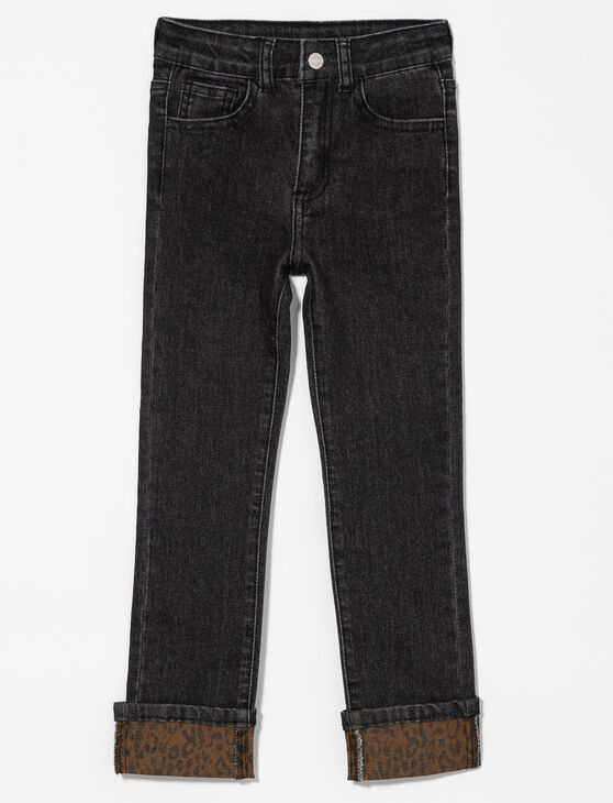 A classic black jean with a bold twist: the rolled cuffs reveal a stylish printed hem that adds a fun surprise to any casual outfit.