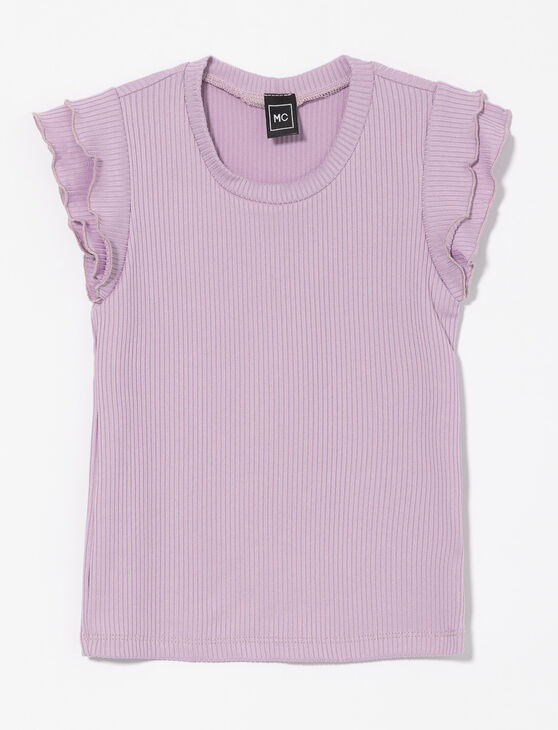 Light and stretchy, this ribbed t-shirt features charming ruffle sleeves. Easy to wear and pair, it’s a comfy choice for everyday adventures.